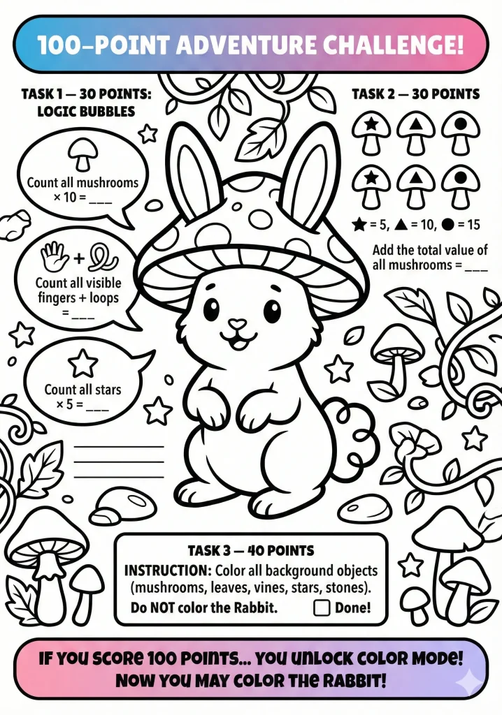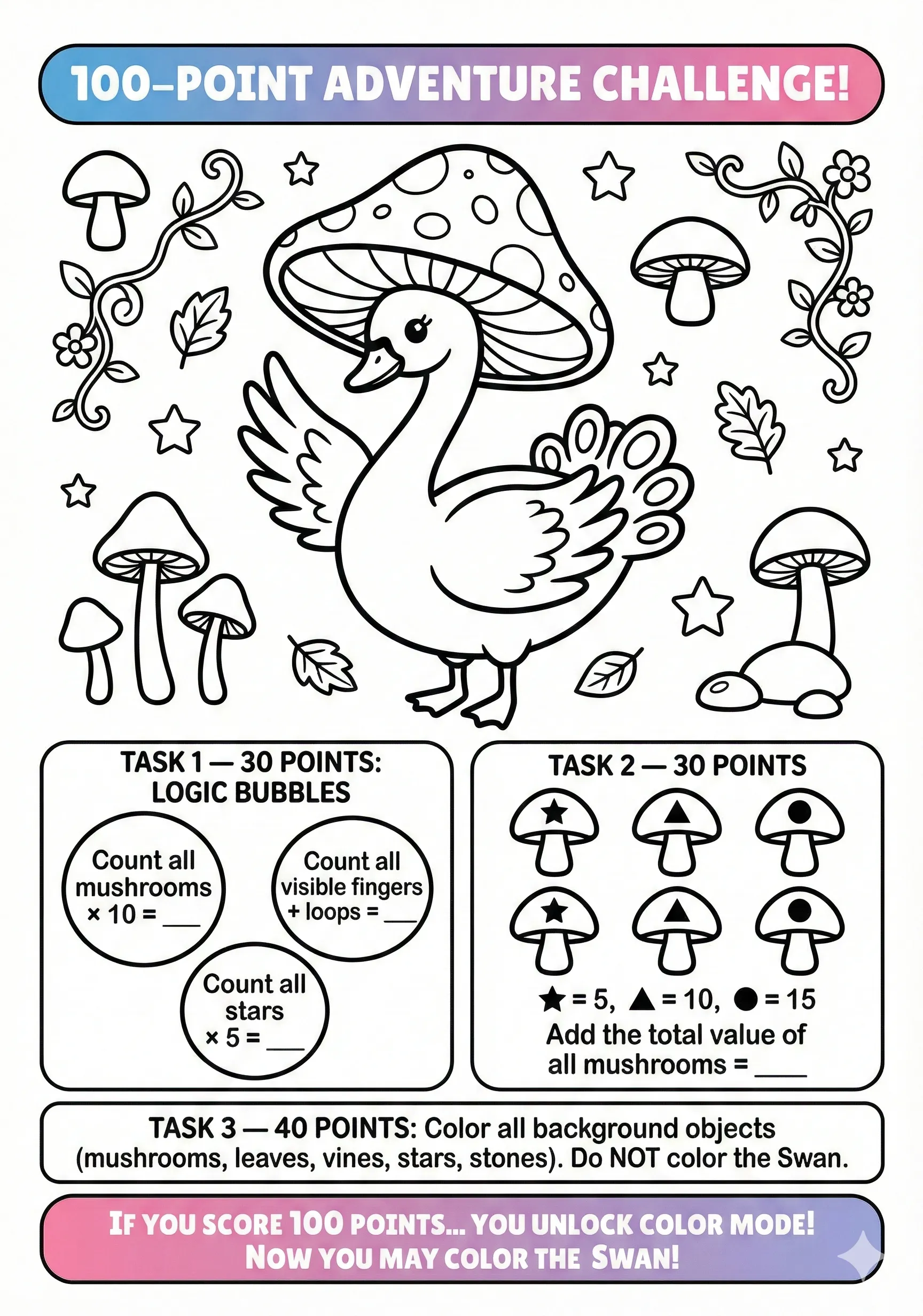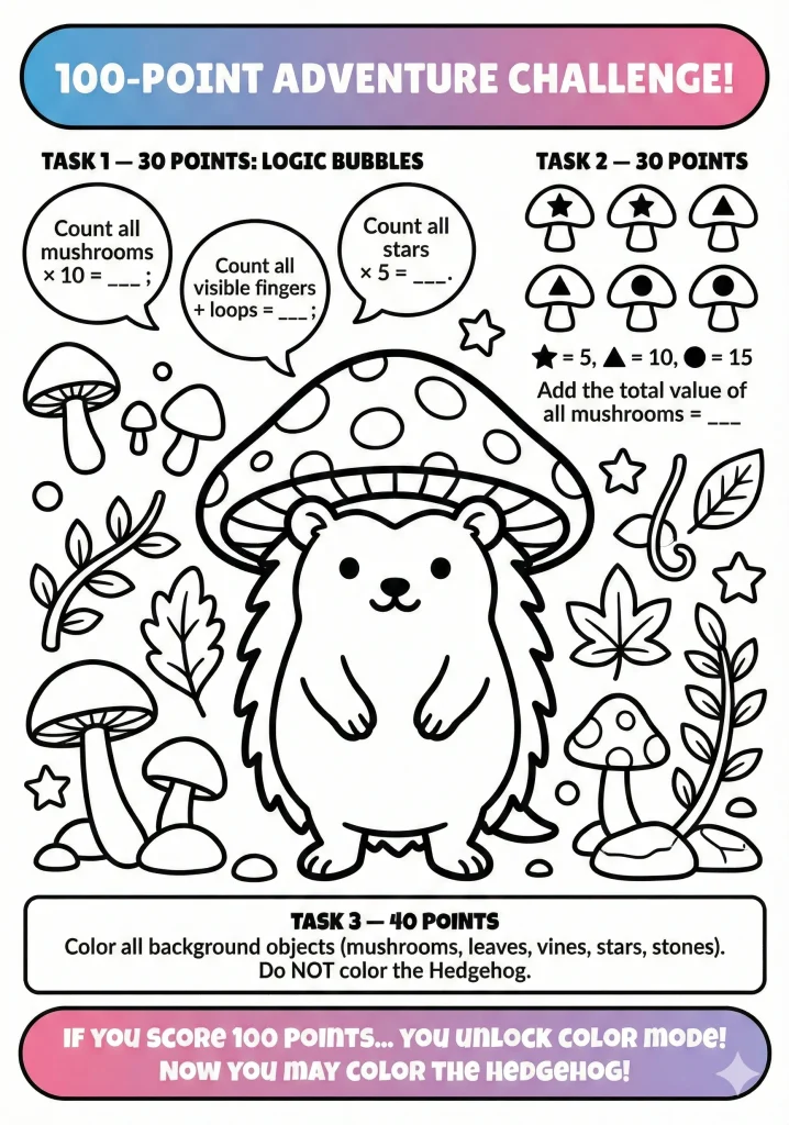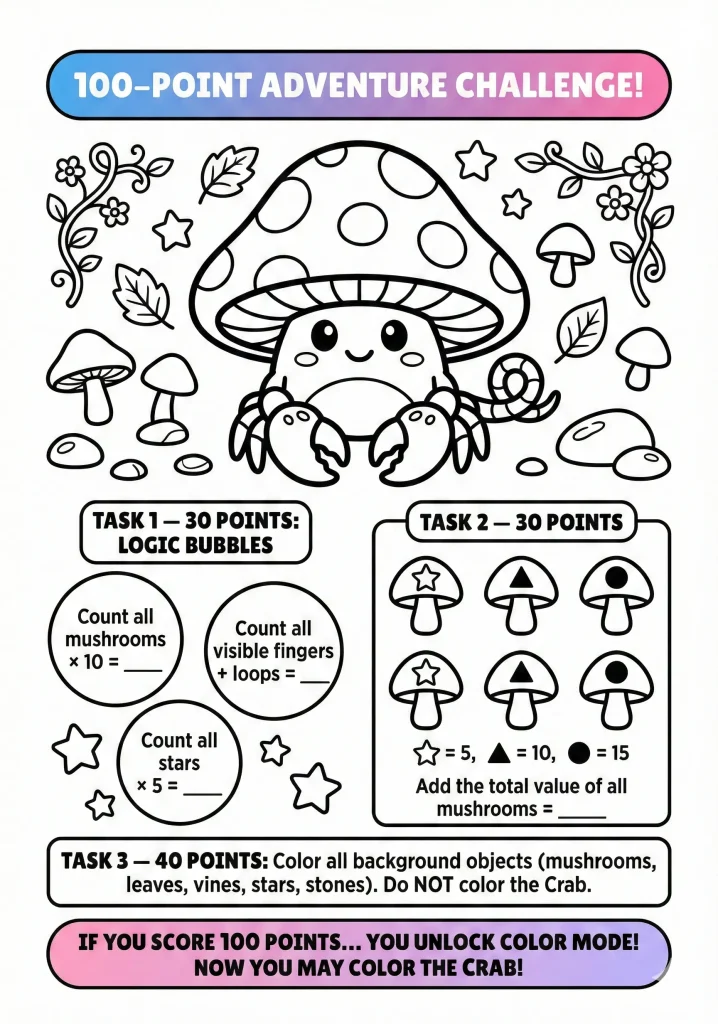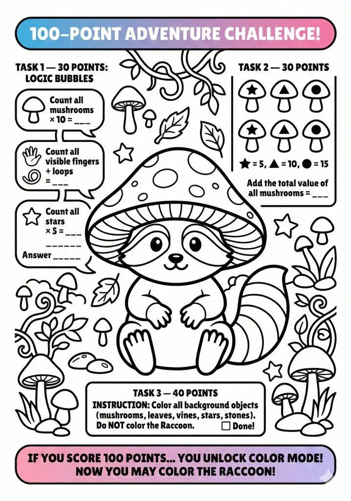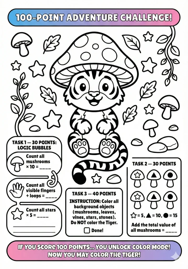 Pages where kids earn points, complete missions, and unlock the coloring phase — turning every sheet into a mini-game.