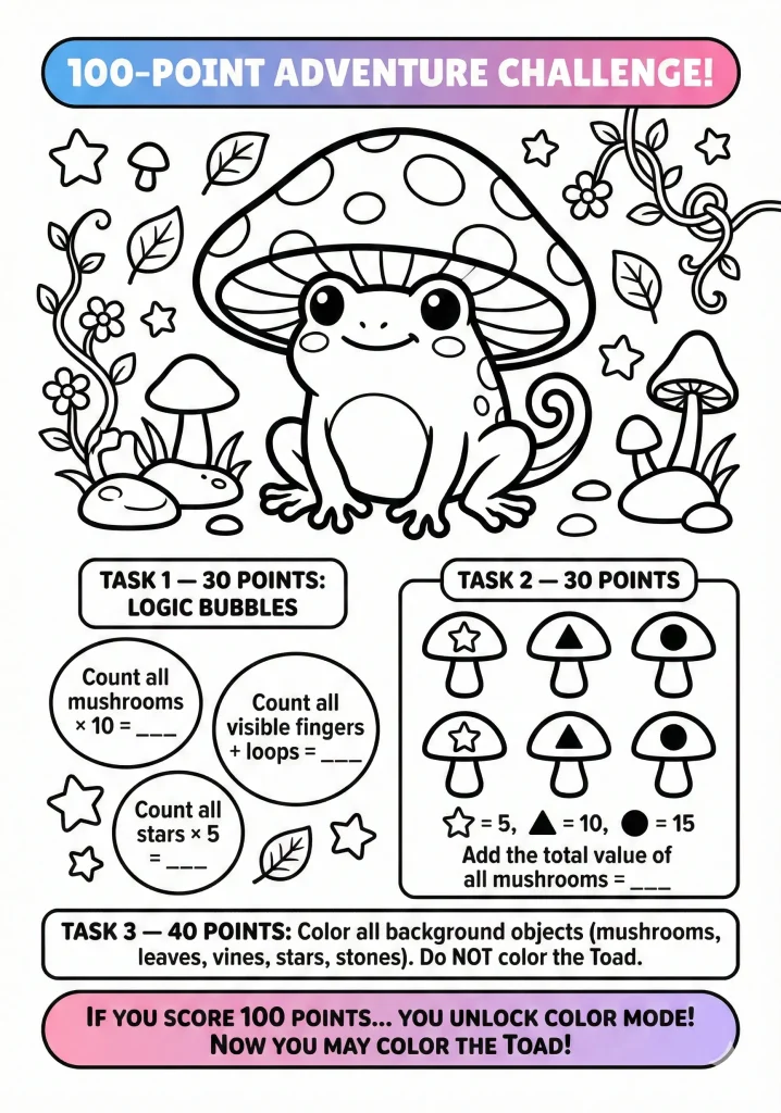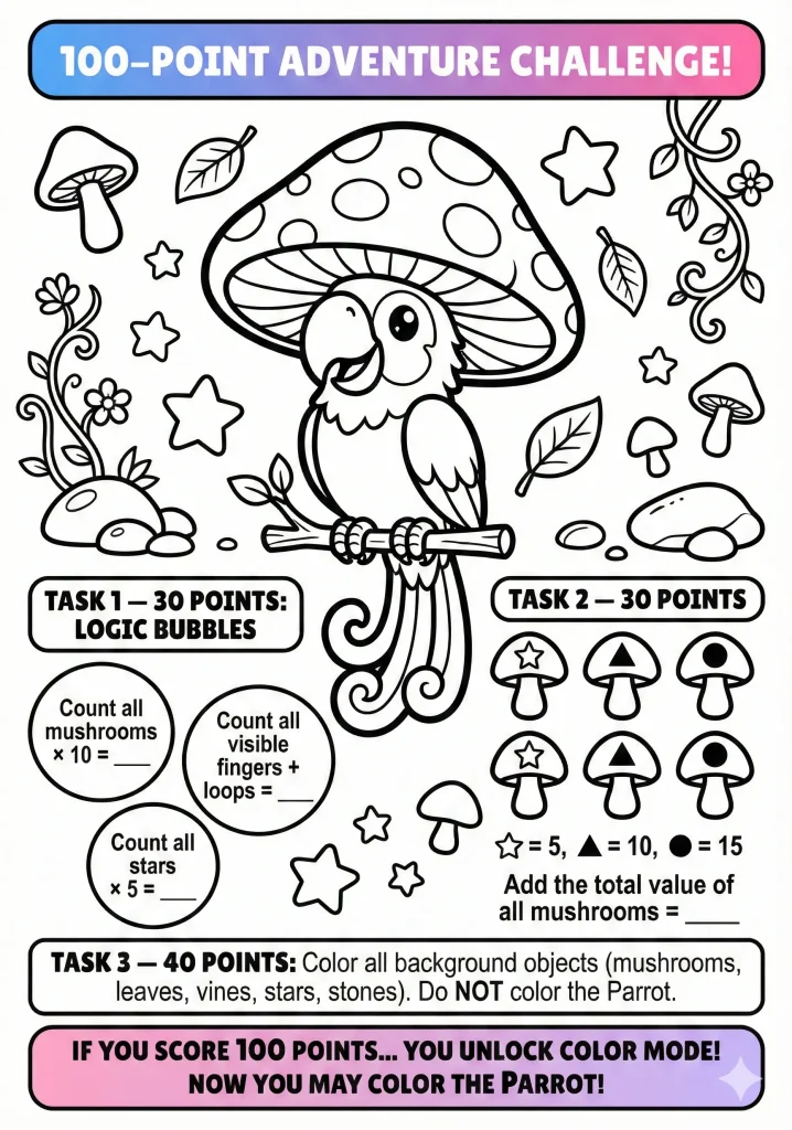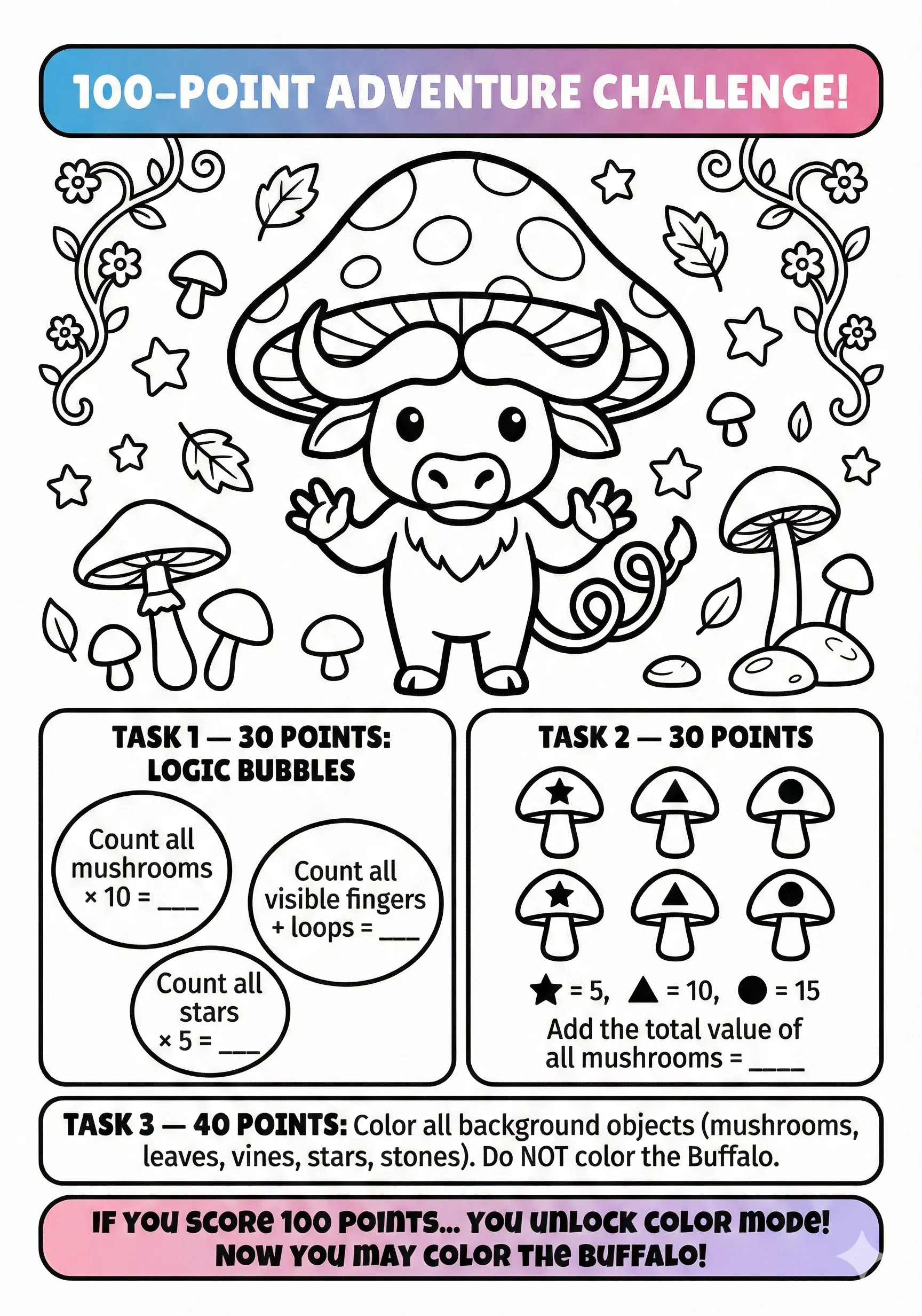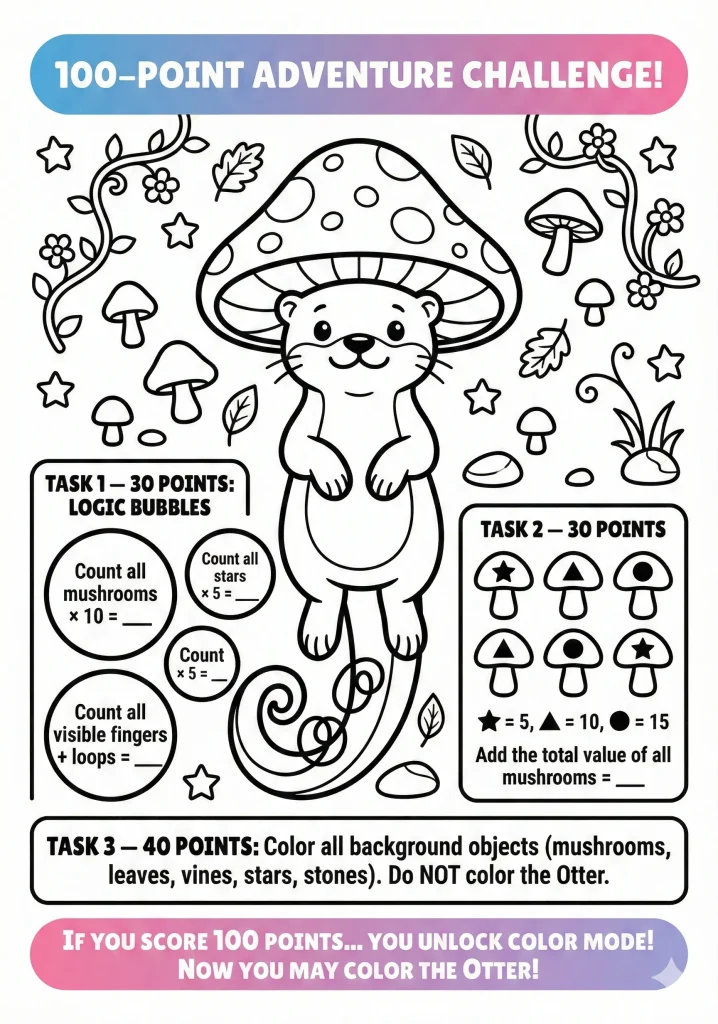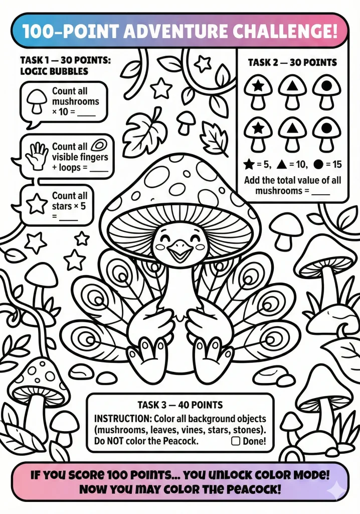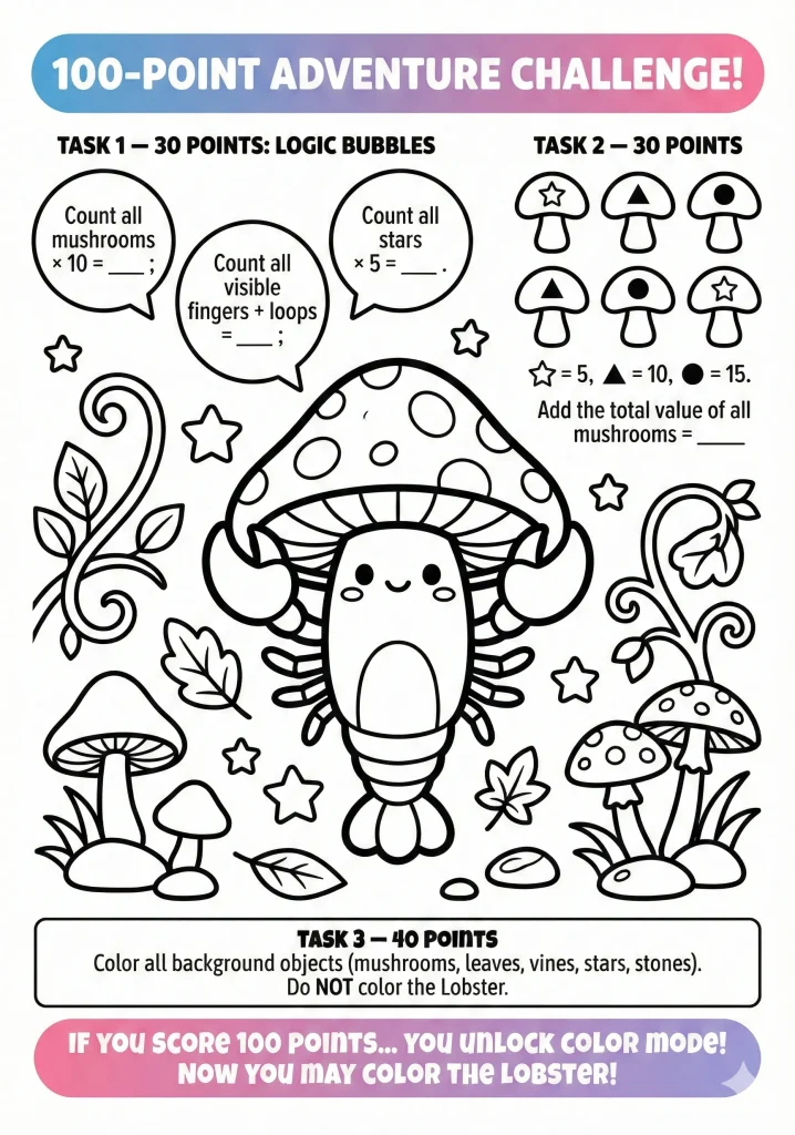 Pages where kids earn points, complete missions, and unlock the coloring phase — turning every sheet into a mini-game.